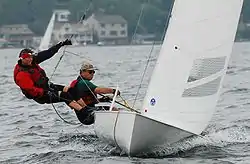 Матрос яхти Flying Dutchman на трапеції під час різкого перекладання стерна.