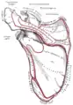 Поперечна артерія шиї (лат. a. transversa colli), потилична артерія (лат. a. occipitalis), надлопаткова артерія (лат. a. suprascapularis), задні міжреберні артерії (лат. aa. intercostales posteriores).[4]