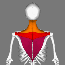 - Нижня частина може бути зміцнена тягами прямих рук згори при рухах лопатки донизу («обернені-» або «верхні шраги»). Вона також працює у всіх видах тяг згори та при підтягуванні