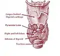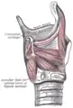 М'язи гортані — боковий вигляд. Права частина щитоподібного хряща видалена.