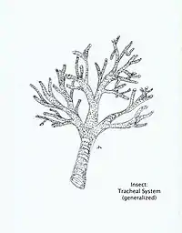 Назовні трубочки відкриваються парними отворами — дихальцями, або стигмами. Кожне дихальце комах обслуговує три поперечні трахеї, з'єднані між собою трьома парами поздовжніх трахей. Від цих основних стовбурів відходять розгалуження до тканин і органів. Вони закінчуються тоненькими трубочками діаметром 1—2 мкм — трахеолами. Кінці трахеол або лежать на поверхні окремих клітин, або входять усередину їх.