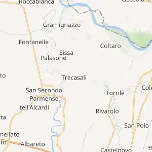 Треказалі розташоване на відстані[1] близько 390 км на північний захід від Рима, 100 км на північний захід від Болоньї, 16 км на північ від Парми.