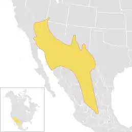 Вид поширений на південному заході США (захід Техасу, південь Нью-Мексико, південь Аризони, південний схід Каліфорнії, крайній південь штату Невада, і крайньому південному заході штату Юта), на півночі і центрі Мексики. Природними середовищами проживання є субтропічні або тропічні чагарники.