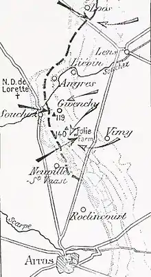 ![]() Карта французького наступу при Артуа у вересні 1915 року Карта французького наступу при Артуа у вересні 1915 року | |||||||