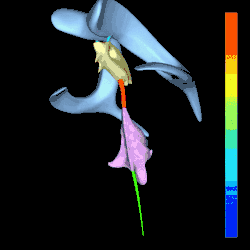 ![]() Синім - Бічні шлуночки Блакитним - Отвір Монро Жовтим - Третій шлуночок Червоним - Сільвієвий водогін Лиловим - Четвертий шлуночок Зеленим - спинномозковий канал Отвори до субарахноїдального простору (не показані) | |
