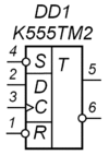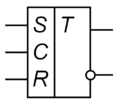 Синхронний Т-тригер[6], при одиниці на вході Т, по кожному такту на вході C змінює свій логічний стан на протилежний, і не змінює вихідний стан при нулі на вході T. Т-тригер можна побудувати на JK-тригері, на двоступінчатому (Master-Slave, MS) D-тригері і на двох одноступінчатих D-тригерах та інверторі.