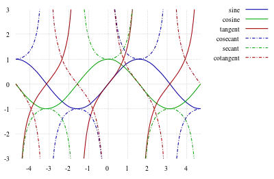Наведемо шість базових тригонометричних функцій. Останні чотири визначаються через перші дві. Іншими словами, вони є означеннями, а не самостійними сутностями.