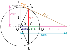 Наведені у таблиці визначення дозволяють обчислити значення функцій для гострих кутів, тобто від 0° до 90° (від 0 до радіан). У XVIII столітті Леонард Ейлер дав сучасні, загальніші визначення, розширивши область визначення цих функцій на всю числову вісь. Якщо розглянути у прямокутній системі координат коло одиничного радіуса (див. малюнок) і відкласти від горизонтальної осі кут (додатня величина кута відкладається проти годинникової стрілки, у протилежному випадку — за годинниковою стрілкою). Точку перетину побудованої сторони кута з колом позначено A. Тоді: