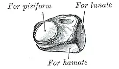 - Долонна — містить у медіальній ділянці овальну грань, що є місцем зчленування з горохоподібною кісткою, а латеральна ділянка має шерехату поверхню для прикріплення зв'язок.