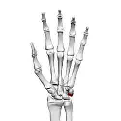 ![]() Ліва рука спереду (з боку долоні). Тригранна кістка виділена червоним. | |