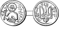 - Святополк Окаянний (князь київський в 1015—1016, 1018—1019) карбував на монетах двозубець у якого один зуб закінчувався хрестом.