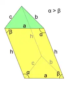 де b довжина сторони трикутника, h висота трикутника опущена на цю сторону, і l відстань між трикутними основами.