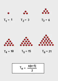 Трикутне число — число кружечків, з яких можна скласти рівносторонній трикутник, так, як зображено на малюнку.