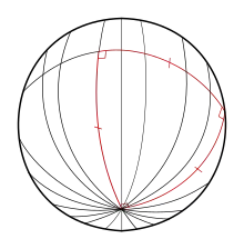 де — це відношення площі сфери до площі обмеженої трикутником. Наприклад, припустимо ми зобразимо трикутник на поверхні Землі (будемо вважати, що Земля це сфера, що насправді не зовсім так) з вершинами на Північному полюсі, на точці екватора з широтою , і точка на екваторі західної довготи. Лінія великого кола між згаданими двома точками буде екватор, а лінія великого кола між кожною з цих двох точок і Північним полюсом буде лінією меридіану; отже отримаємо прямі кути на екваторі. Більш того, кут на Північному полюсі також тому що попередні дві вершини різняться на за довготою. Сума кутів в цьому трикутнику — . Цей трикутник покриває північної півкулі ( якщо дивитись з Північного полюса) і відповідно земної поверхні, тоді підставляємо у формулу ; як бачимо, формула дає правильний результат .