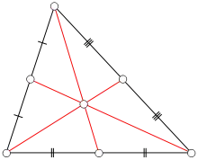 Медіана трикутника — це пряма, проведена через вершину і середину протилежної сторони, вона ділить трикутник на два трикутники однакової площі. Три медіани перетинаються в одній точці, яка називається центроїдом трикутника. Ця точка є також центром мас трикутника: якби трикутник був зроблений з твердого матеріалу, то можна було б тримати рівновагу, тримаючи за центроїд. Центроїд ділить кожну медіану у співвідношенні , наприклад відстань між вершиною і центроїдом вдвічі більша ніж між центроїдом і протилежною стороною.