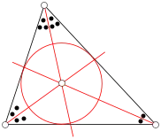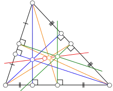 Бісектриса трикутника — це пряма, проведена через вершину трикутника, яка ділить відповідний кут на дві рівні частини. Три бісектриси перетинаються в одній точці, інцентрі, центрі вписаного в трикутник кола. Вписане коло — це коло, яке лежить всередині трикутника і дотикається до трьох його сторін. Окрім того, є ще три важливі кола — зовнішні вписані; вони лежать за межами трикутника і дотикаються до одної його сторони, а також до продовження двох інших. Центри внутрішнього і зовнішніх вписаних кіл утворюють ортоцентричну систему.