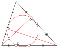 Середні точки трьох сторін і основи трьох висот лежать на одному колі, яке називається колом дев'яти точок трикутника. Решта три точки, через які коло отримало свою назву, — це середини тієї частини висоти, що лежить між ортоцентром і вершиною. Радіус кола дев'яти точок дорівнює половині описаного кола. Воно дотикається до вписаного кола (в точці Феєрбаха) та до трьох зовнішніх вписаних кіл.