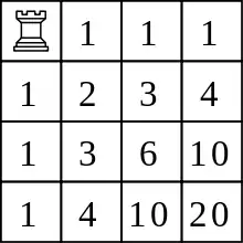 - Сума квадратів елементів рядка n дорівнює середньому елементу рядка 2n. Наприклад, 12 + 42 + 62 + 42 + 12 = 70. У загальній формі: