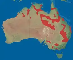 Ендемік Австралії. Вид мозаїчно поширений на півночі та сході материка. Трапляється на вологих луках, евкаліптових відкритих лісах, напівпосушливих степах.
