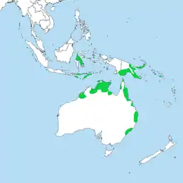 Вид поширений на півночі і сході Австралії, у Новій Гвінеї, деяких островах Індонезії (Малі Зондські острови, Сулавесі, Молуккські острови) та на Соломонових островах.[4] Поширений у районах з високою річною кількістю опадів.
