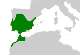 Мешкає у Португалії, Іспанії, Марокко, іноді зустрічається в Алжирі та Тунісі.