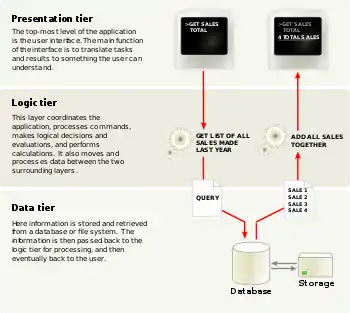 - Сервер бази даних забезпечує зберігання даних і виноситься на третій рівень. Зазвичай це стандартна реляційна або об'єктно-орієнтована СУБД. Якщо третій рівень являє собою базу даних разом з збереженими процедурами, тригерами і схемою, яка описує застосунок в термінах реляційної моделі, то другий рівень будується як програмний інтерфейс, що зв'язує клієнтські компоненти з прикладною логікою бази даних.