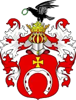 Щит увінчаний дворянським коронованим нашоломником. Нашоломник: обернений вправо чорний ворон, який тримає в дзьобі зелений лавровий вінок.