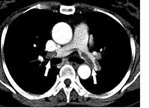 Спіральна комп'ютерна томографія за методикою проведення та затратами є більш простішим обстеженням та рівнозначним по інформативності з селективною контрастною ангіопульмонографією. Цей метод дозволяє виявляти тромби безпосередньо у просвіті судин. Чутливість односпіральної КТ становлять близько 70 %, а специфічність — 90 %. Впровадження в клінічну практику мультиспіральної КТ дозволило підвищити чутливість обстеження до 83 %, а специфічність до 96 %.[14] На думку групи експертів Європейського товариства кардіологів, для хворих з високим ризиком ТЕЛА достатньо проведення односпіральної КТ, а для хворих із низьким та середнім ризиком ТЕЛА необхідне проведення мультиспіральної КТ для більш точної верифікації діагнозу.[15]
