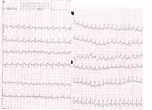 - Тахікардія. Частота серцевих скорочень зростає до 100 за хвилину, іноді можуть спостерігатись приступи фібриляції передсердь та екстрасистолії, може спостерігатись блокада правої ніжки пучка Гіса.[11]