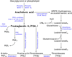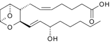 - Широко використовуваний препарат аспірин діє, пригнічуючи здатність ферменту ЦОГ синтезувати попередники тромбоксану в тромбоцитах. Тривале застосування низьких доз аспірину незворотно блокує утворення тромбоксану А <sub id="mwVw">2</sub> у тромбоцитах, виробляючи інгібуючий ефект на агрегацію тромбоцитів. Ця антикоагулянтна властивість робить аспірин корисним для зменшення частоти серцевих нападів.[7] 40 мг аспірину на день здатний інгібувати значну частку максимального вивільнення тромбоксану А 2, що провокується гостро, при цьому синтез простагландину І2 мало впливає; однак для досягнення подальшого гальмування необхідні більш високі дози аспірину[8].