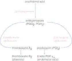 Тромбоксан A 2 (TXA 2), що продукується активованими тромбоцитами, має протромботичні властивості, стимулюючи активацію нових тромбоцитів, а також збільшуючи агрегацію тромбоцитів.