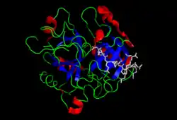 Тромбін (активований фактор зсідання крові II, fibrinogenase, thrombase, thrombofort, topical, thrombin-C, tropostasin, activated blood-coagulation factor II, blood-coagulation factor IIa, factor IIa, E thrombin, beta-thrombin, gamma-thrombin) — білок, який кодується геном F2, розташованим у людей на короткому плечі 11-ї хромосоми.[5][6] Довжина поліпептидного ланцюга білка становить 622 амінокислот, а молекулярна маса — 70 037[7]. Тромбін - важливий компонент системи згортання крові людини і тварин. Тромбін (КФ 3.4.21.5[8]) відноситься до ферментів класу гідролаз, групи серинових протеаз, та каталізує гідроліз пептидних зв'язків, утворених залишками аргініну і лізину (має обмежену субстратну специфічність).