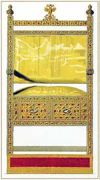 | «Место Царское обложено золотом с каменем с большим и малым и с искрами и с жемчуги большими; на нем влагалище суконное, сверху багрец, а снизу на страфиль червлен; у влагалища по краем снурок шолков червлен; из места из пяти гнезд каменье большие выняты и заверчены в бумашку и привязаны к тому месту; а сказал дьяк Гаврила Облезов, что те каменья вынеты по Государеву имянному приказу для осмотру Государю» |