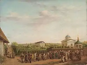 У щойно освяченій церкві, на одній з перших служб, відбулося вінчання кріпака Василя Тропініна з селянською дівчиною Ганною Іванівною Катіною.