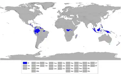 Екваторіальний клімат, як правило, наявний на екваторіальних широтах в басейнах Амазонки в Південній Америці і Конго в Африці, на півострові Малакка і на островах Південно-Східної Азії[1], тоді як не скрізь уздовж екватору клімат є екваторіальним[2] (див також екваторіальна суха зона).