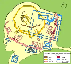 На пагорбі Гіссарлик, де стояла Троя, Шліманом і пізнішими дослідниками виявлено щонайменше 40 пластів, які поділяються на 9 основних культурних шарів. Ці шари мають назви Троя I, Троя II і т. д. До ранньої бронзової доби належать шари з I по V. Загальна товщина цих нашарувань становить приблизно 12 метрів. Вони мають таку велику товщину через періодичні розрівнювання території після пожеж і поховання побутового сміття під шарами глини. В ході розкопок археологи неодноразово розкопували будинки, де цей процес повторювався раз по раз до тих пір, поки рівень підлоги не піднімався так високо, що для нормального проживання в будинку доводилося піднімати вище дах і переробляти вхід.