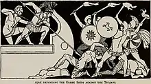 Врешті боги послали вітер і греки висадилися на острові Лесбос, потім на Тенедосі, який розграбували. Витягнувши кораблі на берег між двох мисів, вони облаштували табір, захищений із суші стіною з землі, колод і каміння. В розпочатій війні обидві сторони не тільки боролися одна проти одної, а й розграбовували навколишні землі та острови. Однак війна тривала з перемінним успіхом і ні греки ні троянці не могли пересилити ворога. На десятий рік війни греки, припинивши набіги на Малу Азію, перейшли до облоги Трої. Найхоробріший троянський воїн Гектор загинув у сутичці з Ахіллесом після смерті улюбленого друга Ахіллеса, Патрокла. Після смерті союзника троянців Мемнона, в битві біля Скейської брами, Паріс вразив Ахілла пострілом з лука в п'яту — єдине вразливе місце. Збожеволівши через цю втрату, Аякс вчинив самогубство, а Паріс був убитий Філоктетом, проте троянці й після цього відмовлялися видати Єлену.