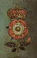 Троянда Тюдорів «зі стеблом та вінцем». Фрагмент портрету Єлизавети I (так званий «Пелікан») роботи Ніколаса Гілліарда (близько 1575)