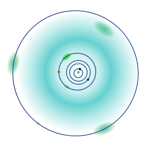 Астероїди на орбіті Марса (показані червоним): група L5 (велика яскраво-зелена область трохи вище планети) і група L4 (невелика блакитна область трохи нижче планети).