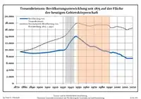 Динаміка населення з 1875 року в сучасних кордонах (Синя лінія: населення; Пунктир: відносна порівняльна динаміка населення землі Бранденбург; Сірий фон: період Третього рейху; Помаранчевий фон: період НДР)