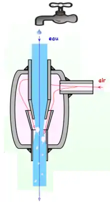 В основі принципу роботи труби Вентурі лежить ефект Вентурі — явище зменшення тиску у потоці рідини або газу, коли цей потік проходить через звужену частину труби.
