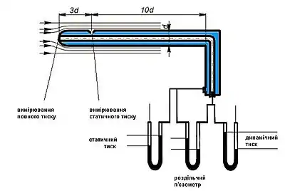 Складається з двох концентрично розміщених трубок, з яких внутрішня служить для вимірювання повного тиску, а зовнішня — статичного. Трубка Прандтля — це удосконалена конструкція винаходу французького вченого А.Піто трубки Піто. Трубка через отвір на торці вимірює повний тиск p1, а через отвір у боковій поверхні — статичний p2.