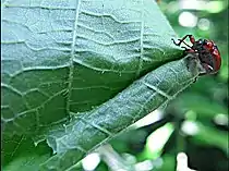 Хоча листок трохи підв'яв, його скручування вимагає від жука чималих зусиль: адже розміри листка і комахи неспівставні.