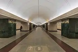 Відповідно до проектного рішення, на склепіннях станції встановлені водозахисні декоративні парасольки з білого склопластику, колійні стіни і колони облицьовані мармуром світлих тонів, вставки між колонами — темно-зеленим[2]. Простий геометричний малюнок гранітного килима на підлозі повторює ритм порталів з чергуванням світло-сірого і чорного каменю. Для освітлювання станції використовується м'якє закарнізнє світло світильниками, прихованими в нішах за карнизом склепіння станції (над порталами — помаранчевого, по всьому залу — білого кольору), а також 18 бульварних ліхтарів з кронштейнами в стилі модерн.