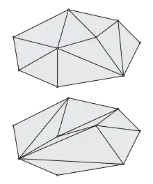 Тріангуляція множини точок в евклідовому просторі — це симпліціальний комплекс, що охоплює опуклу оболонку , і вершини якого належать [1]. У площині (коли — це множина точок з ), триангуляція складається з трикутників разом із їхніми ребрами та вершинами. Деякі автори вимагають, щоб усі точки були вершинами його тріангуляції[2]. У цьому випадку тріангуляція множини точок в площині можна також визначити як максимальний набір ребер, які не перетинаються та з'єднують точки . У площині, тріангуляція — це особливі випадки плоских прямолінійних графів.