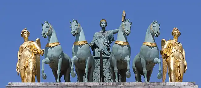 Проєкт арки підготували Шарль Персьє та П'єр Фонтен, що надихнулися формами давньої арки Костянтина в Римі. Споруду увінчує квадрига святого Марка, вивезена з Венеції. Після падіння Наполеона її довелося замінити скульптурною композицією, яка алегорично зображає тріумф Бурбонів (скульптори Франсуа-Фредерік Лемо, Франсуа Жозеф Бозіо).