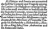 | щодо комедій, засвідчимо його «Двох веронців», «Комедію помилок», «Марні зусилля кохання», «Тріумф кохання», «Сон літньої ночі» та «Венеційського купця»
