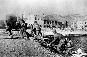 ![]() Радянські війська висаджуються десантом на причалі міста. 1942 Радянські війська висаджуються десантом на причалі міста. 1942 | |||||||||