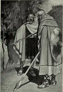 Коли вони прийшли до Ірландії, Фір Болг ще володіли цими землями. Магічна хмара приховувала Племена богині Дану від очей Фір Болг, але коли хмара розсіялася, місцеві жителі виявили, що північно-західна частина Коннахта захоплена невідомими противниками. Тоді Фір Болг послали свого воїна по імені Сренг у табір прибульців. Ті ж вислали на зустріч Бреса. Воїни обмінялися списами. Списи корінних жителів були важкі, а списи Племен богині Дану — легкі, але гострі. Деякі дослідники вбачають у цьому протиставлення грубої фізичної сили та інтелекту.[2]