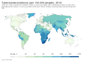 Експерти Всесвітньої організації охорони здоров'я (ВООЗ) вважають, що хвороба входить до переліку 10-ти найбільш смертельних хвороб[17]. У 2007 р. по всьому світу було приблизно 13,7 мільйонів хронічних хворих.[18] 2016 року 10,4 мільйона людей захворіли на туберкульоз, а 1,7 мільйона людей померли від цієї хвороби (у тому числі 0,4 мільйона серед людей із ВІЛ-інфекцією). Більше 95 % випадків смерті від туберкульозу виникають у країнах з низьким та середнім рівнем доходів (країнах, що розвиваються). У 2016 році близько 1 мільйона дітей захворіли на туберкульоз, а 250 тисяч дітей померли від нього (у тому числі дітей, хворих на ВІЛ-інфекцію).[17][19] Усе більше людей у країнах, що розвиваються, захворюють на туберкульоз через знижений імунітет. Зазвичай вони захворюють на туберкульоз через наявність ВІЛ-інфекції, яка з часом переходить у СНІД.[15] Туберкульоз є провідною причиною смерті ВІЛ-позитивних людей: у 2016 році 40 % випадків летальності від ВІЛ-інфекції були пов'язані з туберкульозом. У людей, що інфіковані ВІЛ, до 30 разів частіше розвивається активний туберкульоз.[17]. У 2016 році найбільша кількість нових випадків туберкульозу відбулось в Азії (45 %), а потім в Африці (25 %). 87 % нових випадків відбулось у 30 країнах з високим тягарем туберкульозу. Сім країн мають 64 % випадків від загальної кількості захворілих, на чолі з Індією це Індонезія, Китай, Філіппіни, Пакистан, Нігерія та Південна Африка[17]. Мультирезистентний туберкульоз залишається кризою громадської охорони здоров'я та загрозою для здоров'я. За оцінками ВООЗ, було зареєстровано 600 000 нових випадків стійкості до рифампіцину — найбільш ефективного протитуберкульозного препарату першої лінії, з яких 490 000 хворих мали мультирезистентність[17].